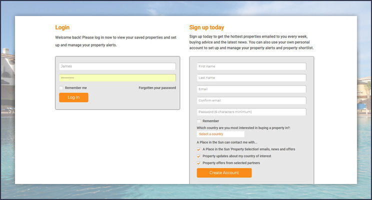 You'll then be prompted to either sign into your A Place in the Sun account or create one if you haven't done so already. This is a quick and easy process, which will allow you to manage your property search a lot easier.