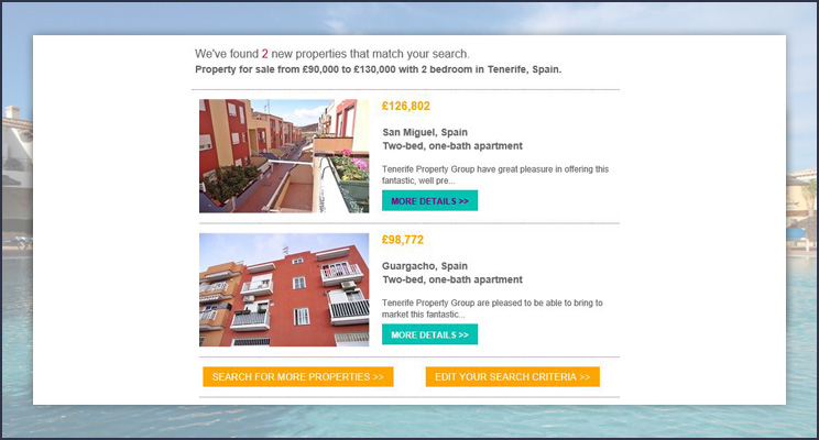 You'll then begin to receive these property alerts in your email inbox at a time convenient for you. The maximum amount of properties on display will be twelve, so if you wish to view more all you need to do is click 'search for more properties', which will take you back to your original search on aplaceinthesun.com.