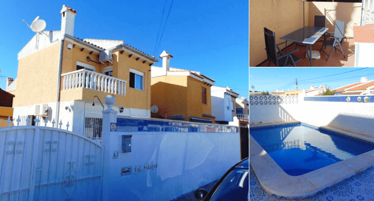 In a popular location near Torrevieja, this three-bedroom, two-bath detached villa comes part furnished and has a small but private swimming pool.