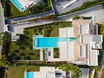 Distributed over three levels, villa welcomes you into an impressive entrance hall with double height ceiling, which leads to a large open-plan living area. The large living room is furnished with high quality furniture and overlooks the tropical garden of the villa. The living room connects with the impressive dining area and the modern kitchen. The living room and dining area have direct access to the covered and uncovered terraces, with several chill-out areas and stunning infinity pool. Upstairs, the villa welcomes you into spacious bedrooms, overlooking the greens of Los Naranjos Golf.