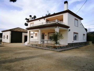 Country house on a fabulous quiet location on the outskirts of the town of Ontinyent. The property has a surface of 250 m² built on two levels, downstairs comprises of 3 double bedrooms, toilet, family bathroom, kitchen with panty and utility, large dining room and sitting room with fireplace, also, there is a front south facing terrace. Upstairs you have 2 double bedrooms more, bathroom, storage area and a sunny terrace. Standing on a generous 5,400 m² fenced and gated land plot, with olive and fruit trees, which is complete with a lovely filtered pool, 68 m² garage, storeroom and barbecue. This property serviced by mains electricity, mains water, fireplace, central heating and double glazed. Excellent location in a slightly elevated position, with stunning views down the valley. This property would make for an ideal family or holiday home, in this tranquil location, just 1.5km from the town and has a good road access.